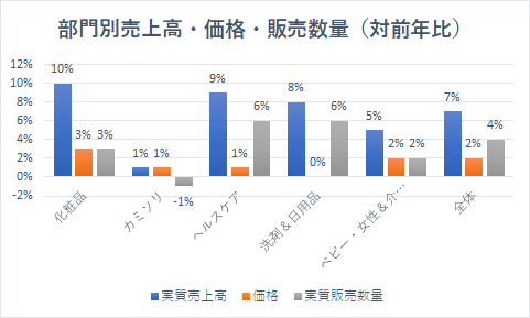「全体」の実質売上高は同+7%の増収、価格は+2%、販売数量+4%と好調でした。全部門で好調だったことが要因です。