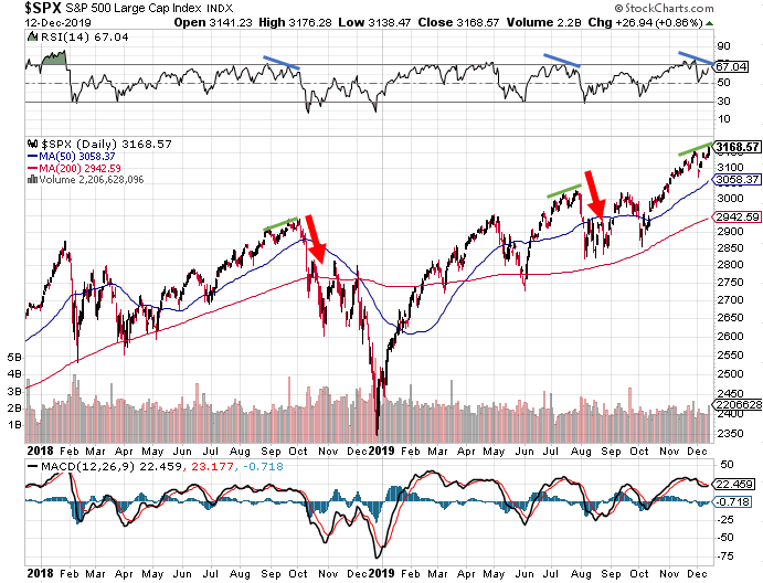 通常、ダイバージェンスは強気トレンドの最終局面に出やすいシグナルとして知られており、事実、過去二回にわたってダイバージェンスの直後に株式市場は急落しました。そのため、米中通商協議の合意は「材料出尽くし」と解釈されて株式市場が急落しかねません。