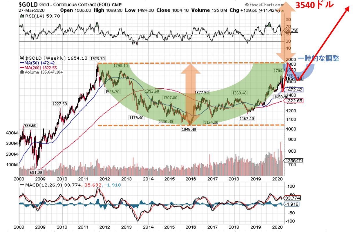 金先物価格の長期チャートを眺めると、「カップ・ウィズ・ハンドル」を形成しつつあることがわかります。これはティーカップのようなカタチをしていることからその名が付いたチャートパターンなのですが、1923ドルの最高値付近まで到達したら、一時的な利食いと調整を経て、再び最高値をトライし、ネックラインを上にブレイクアウトすれば、カップの縦幅だけ上昇が期待できるというものです。