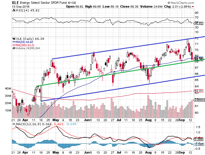 エネルギー・セレクト・セクターSPDRファンド(XLE)の週足チャートです。緩やかな強気のトレンドチャネルを形成しており、68ptのサポートラインを試す展開です。これを割り込むようなら66ptがターゲットになります。