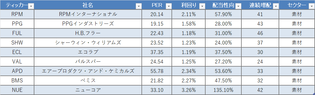 バフェット太郎のように配当再投資を実践したい投資家は、将来に渡って安定して配当を出してくれるような優良株に投資しなければなりません。以下の銘柄は、「配当王」を除いた「配当貴族」の中から、楽天証券で買える素材株です。(*配当王=連続増配50年以上:配当貴族=連続増配25年以上50年未満)