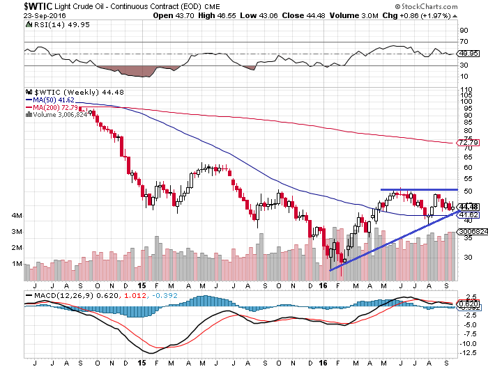 原油先物相場の週足チャートです。来週から始まるOPECの非公式会合で産油国間での増産凍結合意がなされるのかどうなのかということを市場参加者たちは注視しているのですが、もともと仲の悪い国同士なので合意には至らない可能性の方が大きいです。そのため、予想外に増産凍結の合意がなされた場合、50ドルのレジスタンスを突破すると思います。一方で市場の予想通り合意に至らない場合は、40ドル~50ドルのレンジ相場を形成する可能性があります。