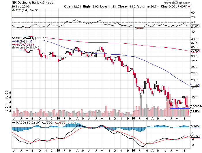 チャートはドイツ銀行(DB)の週足チャートです。12.5ドルのサポートラインを割り込み下落が止まりません。これにつられて英バークレイズは-1.97%安、仏BNPパリバは-3.37%安、米ウェルズ・ファーゴ(WFC)-1.88%安、米バンク・オブ・アメリカ-2.77%安、シティグループ-2.67%安、JPモルガン・チェース-2.19%安、ゴールドマンサックス-2.21%安と世界中の銀行株が叩き売られました。