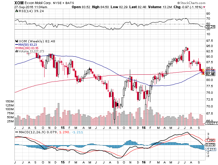 XOMの週足チャートです。OPECの非公式会合を28日に控えており、減産見送りとなれば原油価格は急落しエネルギー株が売られるかもしれません。ただし、減産の見送りはある程度相場に織り込まれていると思います。
