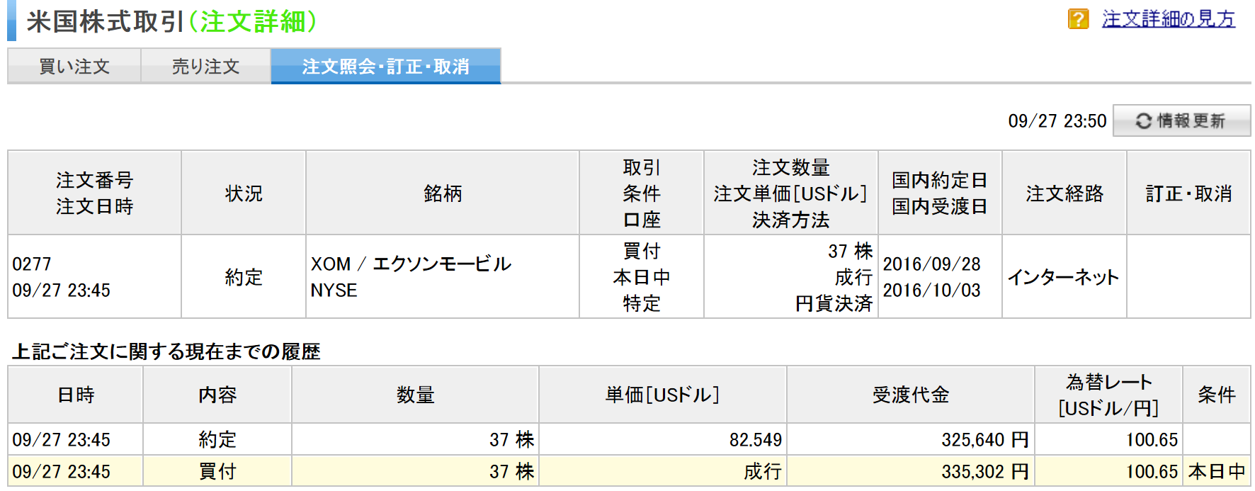 米石油最大手のエクソン・モービル(XOM)の株式を37株(32万5640円)分買い増しました。