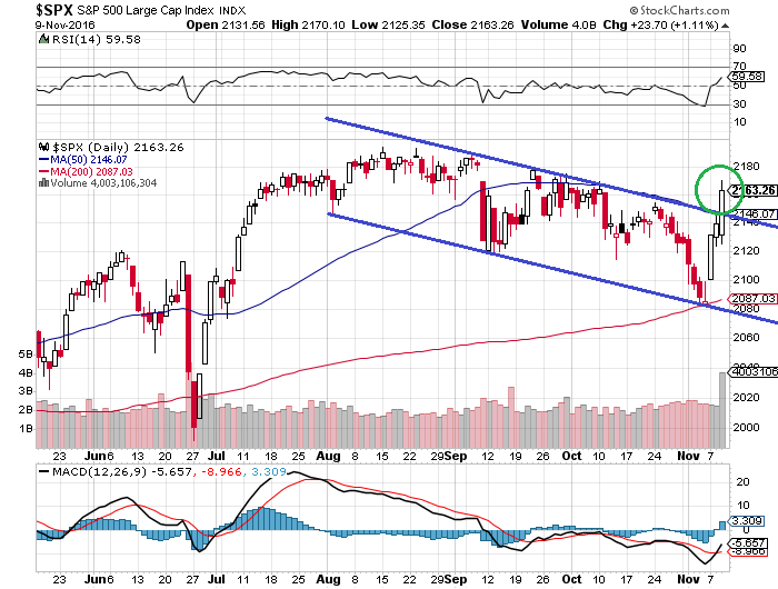 「トランプ大統領で株は下がる」と思ってたけれど、それは間違いでした。NYダウ先物市場こそ一時-5%安になるなど急落していましたが、マーケットが開くと一転してプラスに転じ、結局、前日比+256.95ドル(+1.40%)高の1万8589.69ドルで取引を終えました。S&P500指数も+23.70pt(+1.11%)高の2163.26ptと上昇して取引きを終えました。