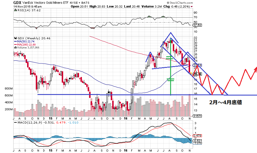 GDXの週足チャートです。天井のサインを示すヘッドアンドショルダーを形成後、大統領選挙の結果を受けてネックラインを割り込みました。ヘッドアンドショルダーはネックラインからヘッドまでの長さと等しい長さで下落するので、ターゲットは16ptで来年の2~4月頃底値をつけると思います。