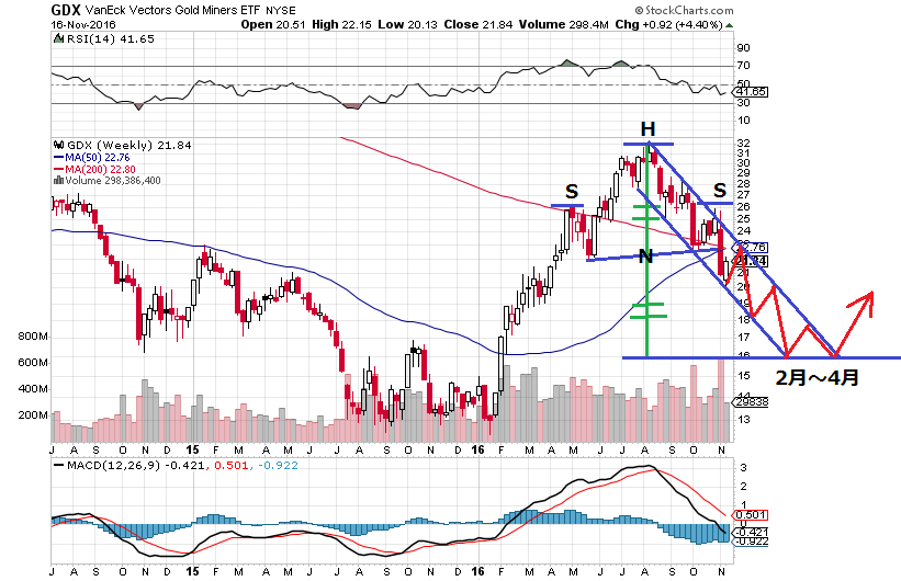 チャートはヴァンエック・ベクトル・金鉱株ETF(GDX)の週足チャートです。チャートを眺めると5月から11月にかけてヘッド&ショルダーを形成したことが確認できます。