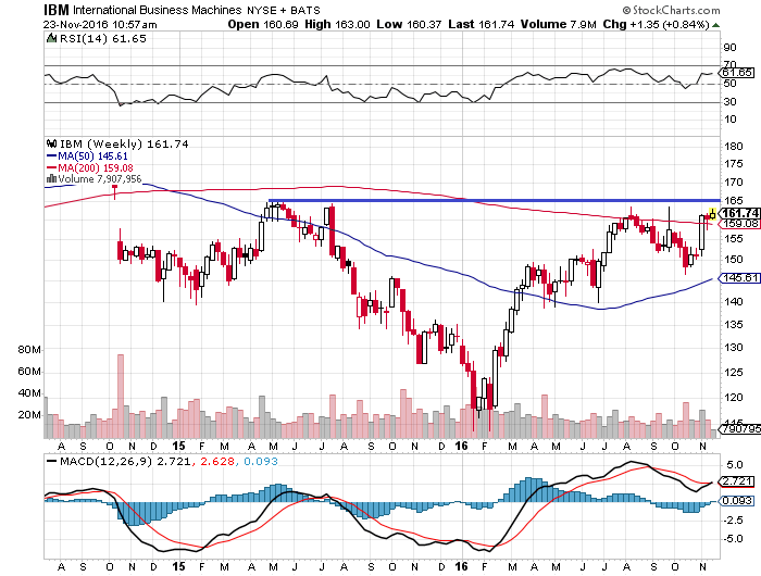 IBMの週足チャートです。IBMは約2年間、165ドルのレジスタンス(上値抵抗線)をブレイクアウトできずにいます。