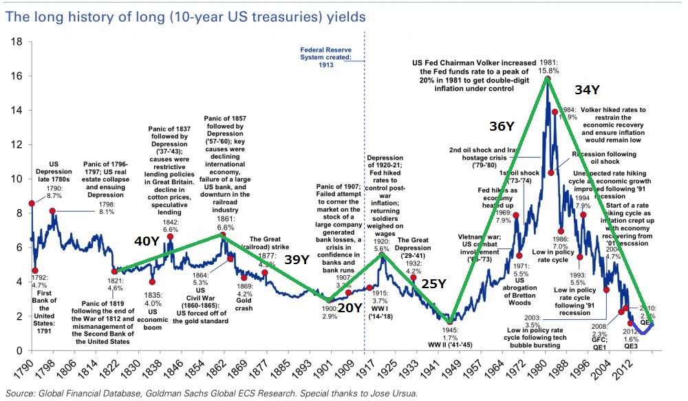 過去の経験則に従えば、1945年から1981年にかけて36年間、金利が上昇したことから、34年後の2016年末、そろそろ米国債の強き相場が終わると予想できるわけです。