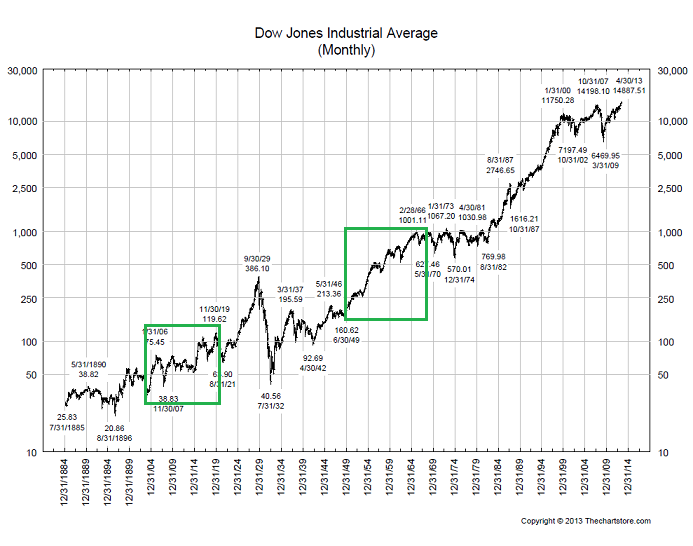 金利が上昇する局面では米国債や金が売られ、株が買われると思われがちです。実際、金利が上昇すると株が上がり債券価格や金価格は値下がりしますが、長期トレンドで眺めるとそうとも言い切れません。1945年から1981年にかけての36年間、NYダウは150ドルから1000ドルと6.7倍しか上昇していないのです。一方で金利の上昇に弱いとされる金価格は1オンス34.71ドルから800ドルと23倍にも上昇したのです。