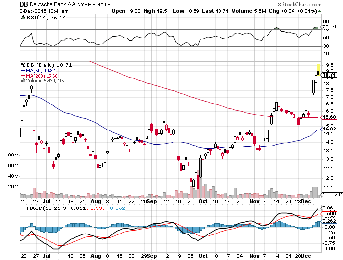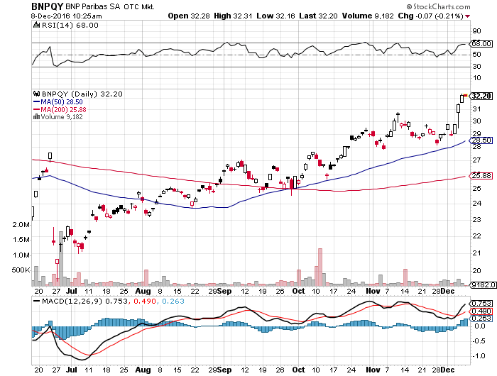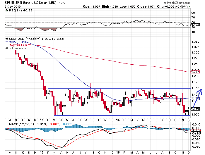 ユーロドルの週足チャートです。レンジ相場のサポートラインに反発し、レジスタンスの1.15ドルを目指すと思います。金利上昇局面に強いとされるユーロを代表する銀行株にドイツ銀行と仏BNPパリバがありますが、株価はすでに大きく上昇しています。