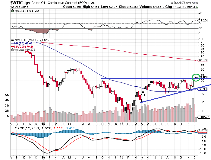 原油価格上昇の背景には、OPEC(石油輸出国機構)と非OPECが15年ぶりに協調減産に踏み切ったことが好感されたことが挙げられます。原油先物価格は前日比+2.58%高の1バレル52.83ドルで取引を終えましたが、一時は54.51ドルまで値を伸ばしました。