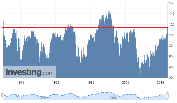 そもそもコンファレンス・ボードの消費者信頼感指数というのは、全米産業審議委員会という米国の民間調査機関が、アンケート調査で現在と半年後の将来の景況感、雇用状況、所得、自動車や住宅の購入計画などの項目について、楽観か悲観かで回答された結果を指数化したものです。