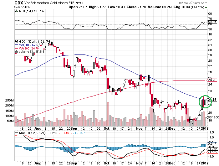 チャートはヴァンエック・ベクトル・金鉱株ETF(GDX)の日足チャートです。50日移動平均線を上回るかが注目されていますが、バフェット太郎はまだ下がると予想しています。2017年以降、金鉱株に買い場が訪れ、2020年末頃まで一貫して買われると予想しているものの、買い場は「まだ」です。あと、金鉱株はボラティリティが高いので間違ってもレバレッジ型金鉱株ETFに先回り買いとかしないでくださいね。死亡フラグが立つだけですよ。