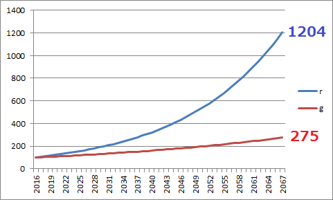 rが年率5%、gが年率2%成長した場合の50年グラフです。2016年末を100とした場合、50年後の2067年にはrが1204に対して、gはわずか275と4.38倍もの差が開きました。これを見て、ほとんどの人たちは資本主義経済においてお金持ちがどんどんお金持ちになって、いつまで経ってもお金持ちになれないとか、あるいはお金持ちはズルいと批判します。