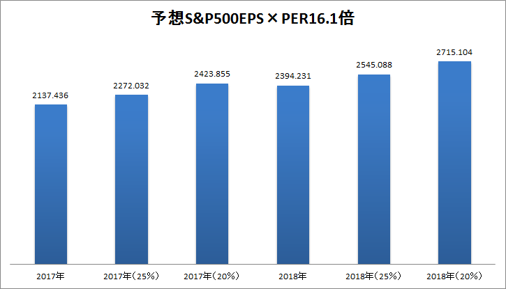 2017年の実効税率を25%とした場合の予想EPSに、平均より低いPER14倍を掛けると予想S&P500指数は1975.68となります。これは現在の水準からー12.6%安の水準であり、この程度の調整幅なら十分にあり得ます。