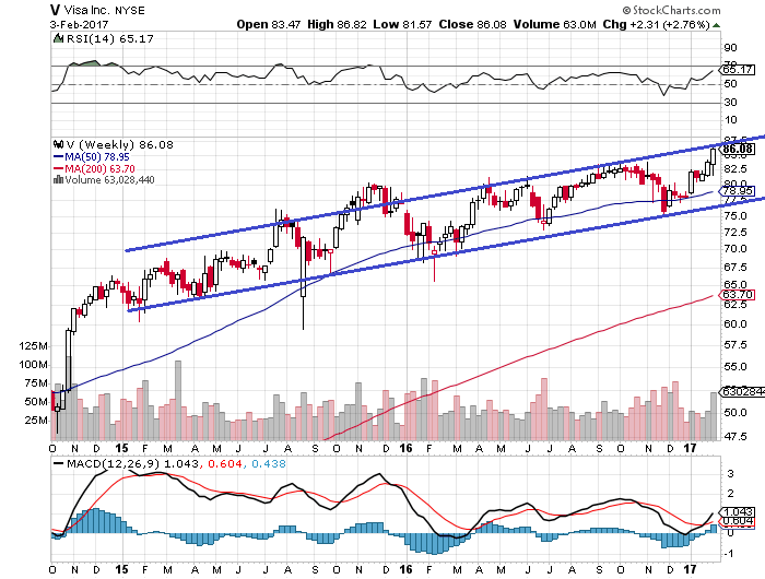 ビザ(V)の週足チャートです。緩やかな上昇トレンドを形成しており、しばらくこのトレンドは続きそうです。