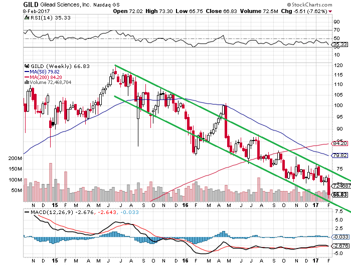 しかし、薬価引き下げ問題や患者数の減少、激しい価格競争などからドル箱のハーボニがピークアウトすると、株価は2015年の高値120ドルからー44%安の66.83ドルと暴落しました。