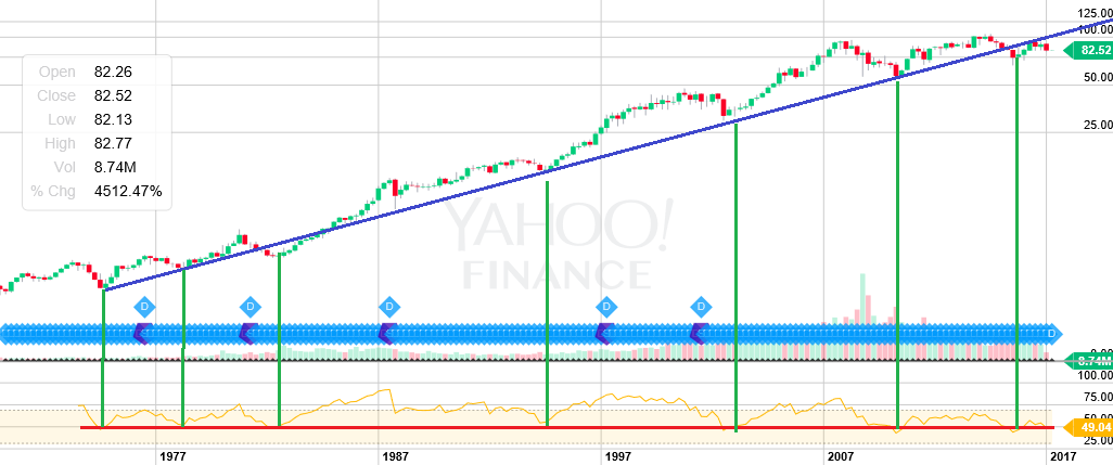 チャートはエクソン・モービル(XOM)の超長期チャートです。過去を振り返ればRSIが50ptを割り込んだ時が「買い場」であることを教えてくれているので、現在は手放すのではなく、むしろ買い増す時期だと考えるのが自然です。