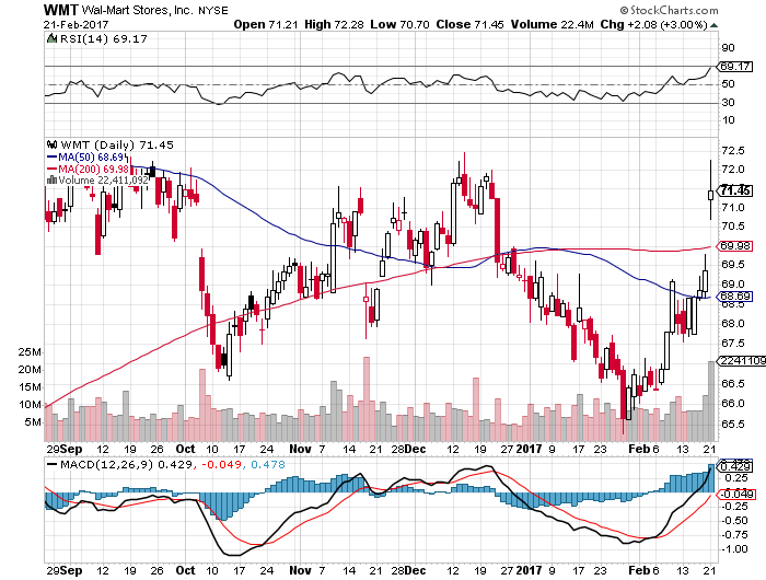 好調な企業決算を受けて株価は前日比+3.00%と急騰しています。ウォルマート(WMT)はターゲット(TGT)やメイシーズ(M)などの競合他社が発表した弱い決算とは対照的に、好調な決算内容でした。特に冬季のホリデーシーズンでの好調な販売が業績に寄与しました。