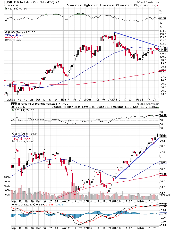 チャートはドルインデックス(USD)と新興国株ETFのエマージング・マーケットETF(EEM)の日足チャートです。