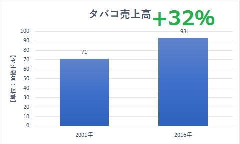 タバコの売上高が増加した主な要因は、一箱当たりのタバコの値段が上がったためです。結果、喫煙率が低下しても売上高は過去15年で32%増加したのです。