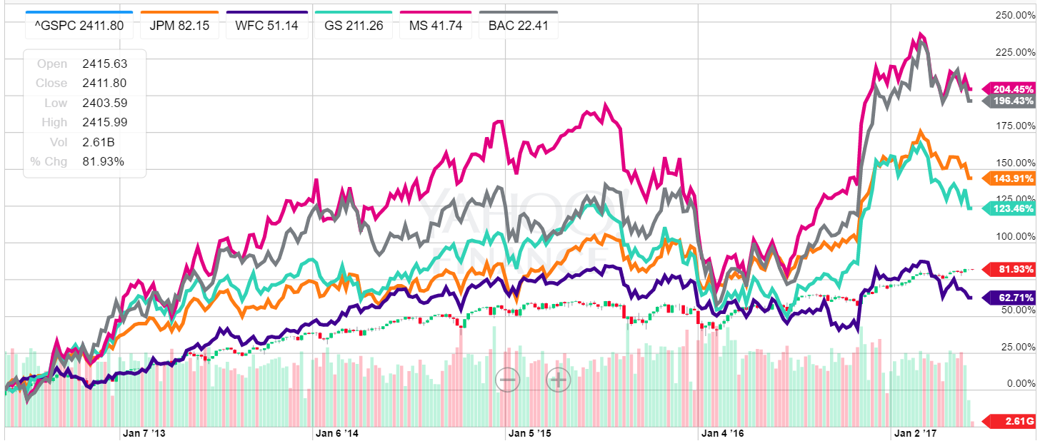 チャートはS&P500指数とJPモルガン・チェース(JPM)など金融株5銘柄の過去五年のリターンを表しています。市場平均を下回ったのはウェルズ・ファーゴ(WFC)の一銘柄のみで、その他4銘柄はS&P500指数を大幅に上回っていることがわかります。つまり、自信のあるセクターへ集中投資した方が報われた例です。