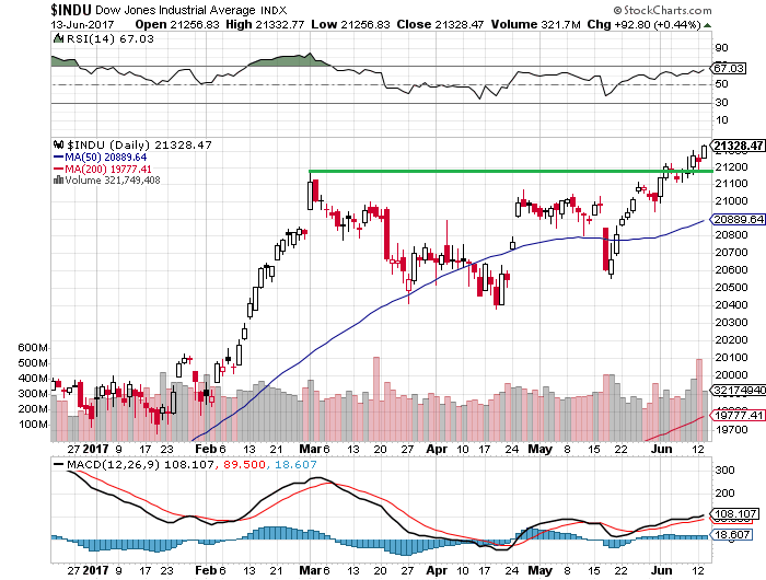 13日のダウ平均は前日比92.80ドル(+0.44%)高の2万1328.47ドルと、史上最高値を更新して取引を終えました。