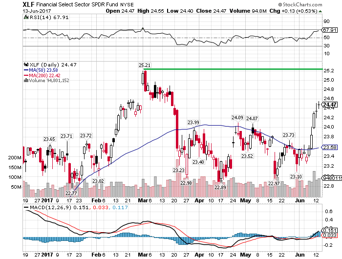 金融株で構成された金融・セレクト・セクターSPDRファンド(XLF)は五営業日連続で続伸しています。昨日、財務省が2008年の金融危機後に導入した金融規制改革法「ドッド・フランク法」を大幅に見直す内容を盛り込んだ報告書を公表したことが買い材料となりました。ただし、ダウ平均が3月の高値をブレイクアウトしているのに対して、金融株は3月の高値から-3%の位置にあるため、金融株が大きく出遅れていたことがわかります。これは、利上げペースが緩慢なものになるとの懸念が嫌気されていたためです。