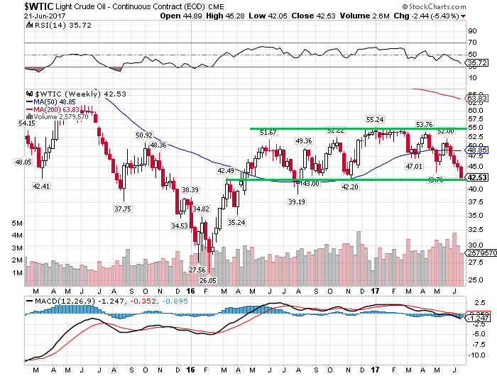 原油先物価格は5月の52ドルから-18%安の42.53ドルと急落しています。