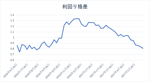 米10年債利回りから米2年債利回りを差し引いたチャートです。この利回り格差が縮小すると金融株は利ざやを稼ぐことができませんから、金融株にとって懸念される材料となっています。