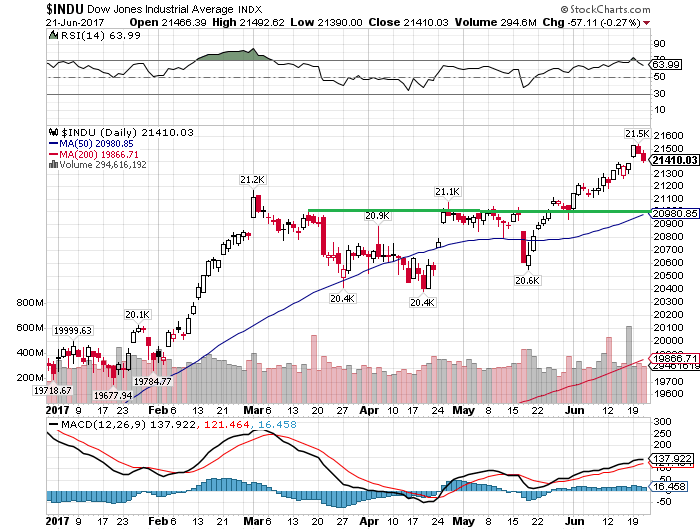 21日のNYダウ株式市場は前日比-57.11ドル(-0.27%)安の2万1410.03ドルと下落して取引を終えました。下落した主な要因は原油安を嫌気してエネルギー株が売られたことに加えて、債券の利回り曲線のフラット化に伴う利ざやの縮小を巡る懸念から金融株が売られたためです。