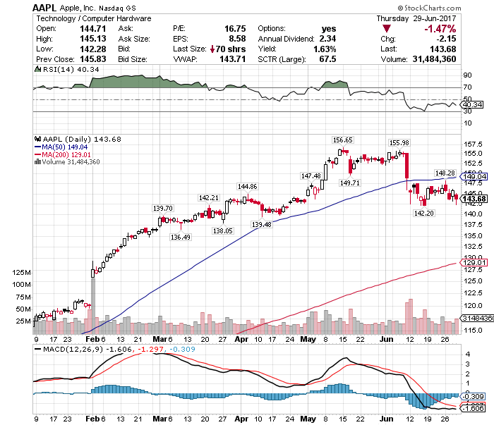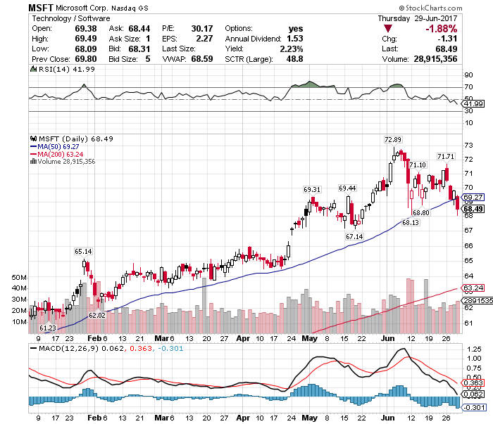大手ハイテク株「BIG5」の一角、マイクロソフト(MSFT)はついに50日移動平均線を割り込んでしまいました。アウト。