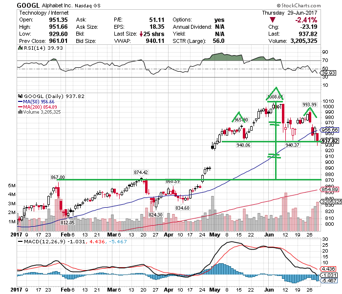 アルファベット(GOOGL)も50日移動平均線を割り込みました。強気トレンドの天井を表すヘッド&ショルダーを形成していたことから、870ドルがターゲットになります。アウト。
