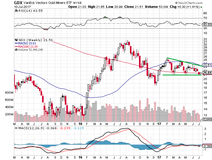 さて、このヴァンエック・ベクトル・金鉱株ETF(GDX)は昨日、21ptのサポートラインに反発して取引を終えました。しかし、チャートを眺めると上値が切り下がっていることから、弱気の三角保ち合いを形成していることが確認できます。この場合、下にブレイクアウトする可能性が高いです。