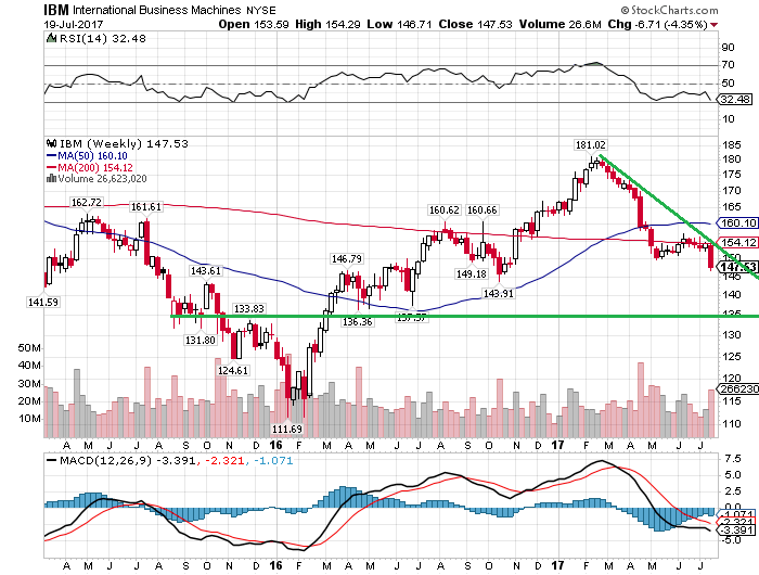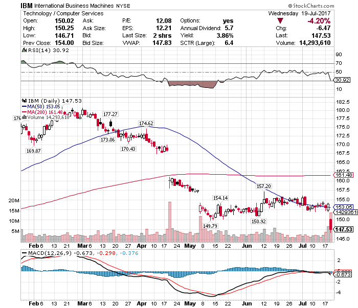 IBMは前日比-4.20%安と急落して取引を終えました。PER12.08倍、予想PER10.69倍、配当利回り3.86%とバリュエーションは魅力的です。