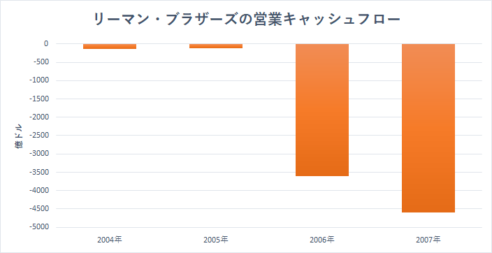 ちなみに、08年の金融危機に破綻したリーマン・ブラザーズも、破綻するまでの過去四年間で営業キャッシュフロー大赤字を計上していました。