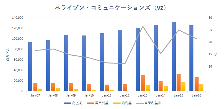 14年にBPS(一株当たりの純資産)が激減しているのは英ボーダフォンからベライゾン・ワイヤレスの株式45%を1300億ドル(約13兆円)で取得して完全子会社化したためです。また、この買収を機にベライゾン(VZ)のROEは12年通期2.53%から、16年通期67.40%と大幅に上昇しました。