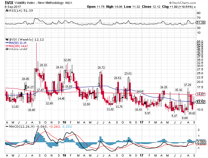 現在、北朝鮮を巡る地政学的リスクが高まりやトランプ大統領に対する政策運営能力の有無、大型ハリケーンによる大規模な自然災害など、「ブラックスワン」となり得る材料が見え隠れしつつある中で、株式市場のバリュエーションは過去最高水準で割高感があり、VIX指数を見る限り多くの投資家たちは不安に怯えている様子はありません。