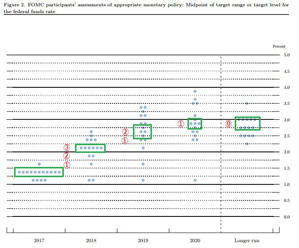 こんな調子で最新のドットチャートを眺めると、18年末までに3回、19年末までに2回、20年末までに1回の利上げが見込まれていることがわかります。ちなみに、19年末は3回から2回に下方修正されています。