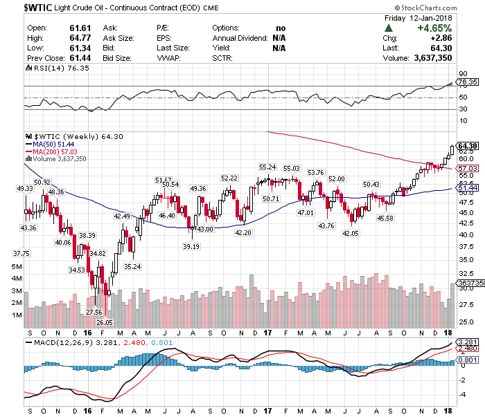 原油先物価格は週間ベースで+4.65%高の64.30ドルと、三年ぶりの高値を付けました。原油価格が上昇している主な要因は、産油国の停滞、供給の混乱、生産量の削減などが挙げられます。また、ドル安も原油高の要因になっています。