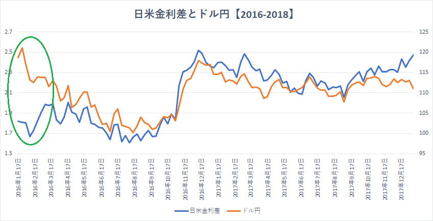 チャートは過去二年間の日米金利差とドル円の推移です。金利差と為替が概ね相関関係にあることがわかると思います。緑の〇で囲ってある2016年1月~3月を眺めると、日米金利差とドル円に大きなギャップがあったことが確認できます。これは市場参加者たちの多くが米国の利上げペースは加速して日米金利差は拡大すると予想しており、ドルを先回りして買っていたためです。