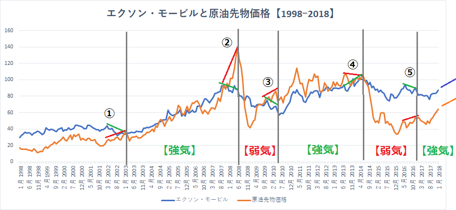 【エクソン・モービルと原油価格:1998-2018】