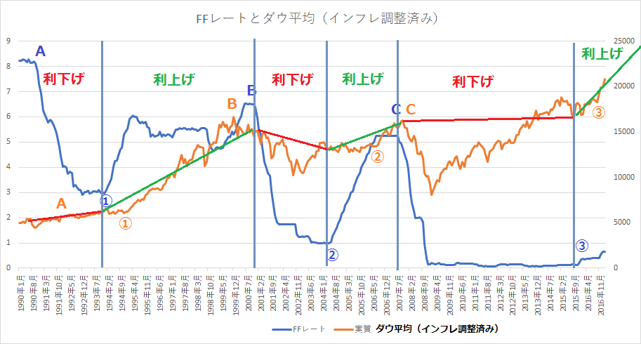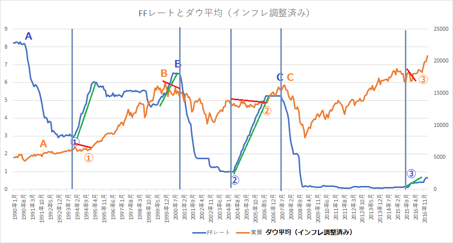 【政策金利とダウ平均(インフレ調整済み):1990ー2017】