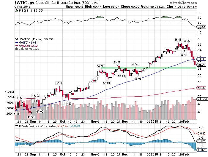 原油先物価格の日足チャートです。今回の株式市場暴落の原因を作ったのは米10年債利回りの上昇ですが、米10年債利回り上昇の背景には原油価格の上昇が挙げられるので、原油価格の動向にも注目しなければなりません。