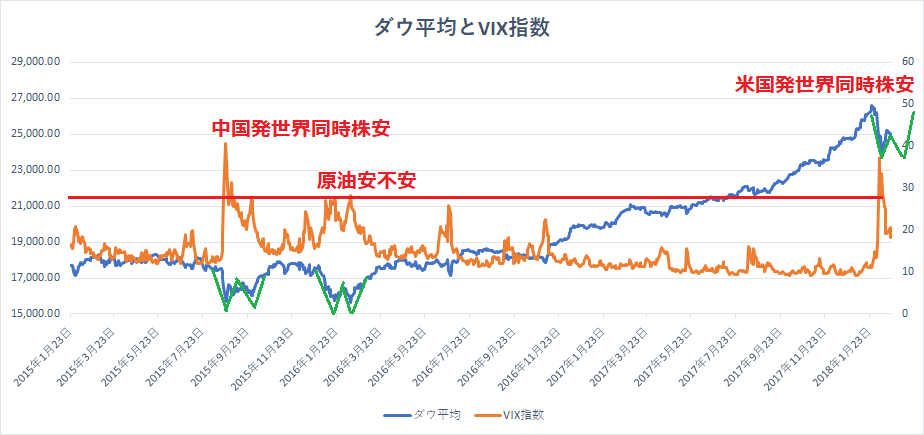 また、過去を振り返ると機関投資家の予想通り、株は再び売られる可能性が高いです。【ダウ平均とVIX指数:2015ー2018】