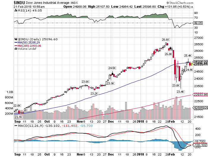 ダウ平均は50日移動平均線を挟んでもみ合いが続いています。