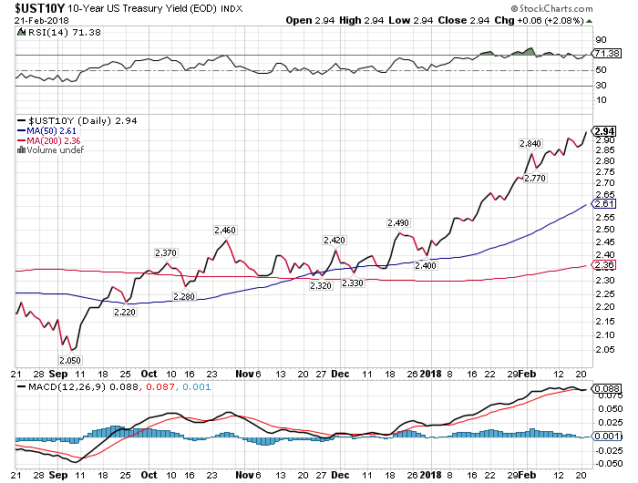 21日のNYダウ株式市場は前日比ー166.97ドル(ー0.67%)安の2万4797.78ドルと続落して取引を終えました。下落した主な要因は、FRB(米連邦準備制度理事会)が公表した1月30、31日のFOMC(連邦公開市場委員会)の議事要旨を受け、10年債利回りが急騰(価格は下落)したためです。