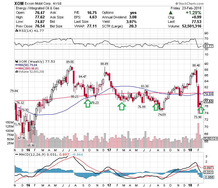 さて、今月の買い増し銘柄は米石油最大手のエクソン・モービル(XOM)でした。エクソン・モービルは2月に発表した第4四半期決算の内容が予想を下回る悪い数字だったことから、直近の高値から16%も売られました。